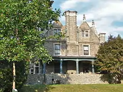 The Robert M. Hogue House is a historic mansion located in the Mount Airy neighborhood of Philadelphia, Pennsylvania. It was built in 1896, and is a 2+1⁄2-story, rectangular stone dwelling in the Jacobean revival-style. It features two-story projecting bays with leaded glass windows, soaring cross gables and dormers, and pointed arch openings. Also on the property is a contributing stable / carriage house and a free standing stone fireplace. It housed the Philadelphia School of Criminology from the late-1940s to 1963, then housed Combs School of Music until 1983.[2]