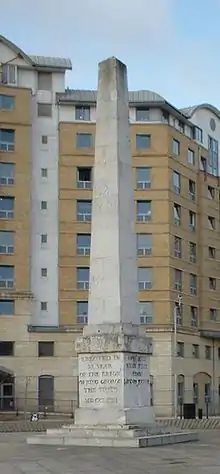 The bridge was opened to all traffic in November 1769. As surveyor, Mylne was also responsible for laying out the approach roads; Bridge Street (now New Bridge Street) from the north, and Surrey Street (now Blackfriars Road) from the south. The squares of Chatham Square and Albion Place were laid out at the north and south ends of the bridge, respectively, and Mylne also designed the obelisk, which still stands, at St George's Circus, in 1771.[16] Although Mylne was briefly the target of satirical anti-Scots cartoons and pamphlets at the time of winning the competition,[17] the completed bridge was universally well-received, and tolls repaid the £152,840 cost of building within a few years.[16] Mylne received his final payment for the works, of £4,209, in 1776,[18] and held the post of surveyor until his death, but the bridge had to be replaced in 1869, after the rebuilding of London Bridge in 1831 affected the flow of the river.[19]