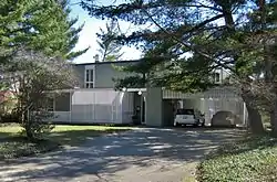 The Robert and Suzanne Drucker House is in the Indian Hills Subdivision of Wilmette. It is on the south side of Iroquois Street halfway between Illinois Road to the east and Hibbard Road to the west. The house stands out on its block, which is otherwise filled with standard historical revival homes. It is situated on a deep rectangular 0.5-acre (0.20 ha) lot with a fenced rear yard. The house sits 85 feet (26 m) back from Iroquois Street. The two-story house is generally L-shaped with its long portion parallel to Iroquois and its wing extension on the west. Typical of the International Style, the house lacks excess ornamentation. Roofs are flat, covered with tar and gravel, and edged with aluminum. Exterior walls are painted vertical board-and-batten cedar siting. Doors and windows have painted metal frames. The carport, porches, and terrace have wood privacy walls.[2]
