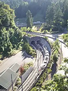 The Robertson Tunnel is a twin-bore light rail tunnel through the Tualatin Mountains west of Portland, Oregon, United States, used by the MAX Blue and Red Lines. The tunnel is 2.9 miles (4.7 kilometers) long[1] and consists of twin 21-foot-diameter (6.4 m) tunnels. There is one station within the tunnel at Washington Park, which at 259 feet (79 m) deep is the deepest subway station in the United States and the fifth-deepest in the world.[5] Trains are in the tunnel for about 5 minutes, which includes a stop at the Washington Park station. The tunnel has won several worldwide engineering and environmental awards.[6] It was placed into service September 12, 1998.[7]