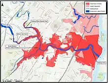 The headwaters of Robinsons Branch are in Fanwood, Plainfield[2] and Edison, New Jersey.[3] It flows through Scotch Plains, Westfield, Clark, and Rahway, emptying into the Rahway River approximately five miles above the Arthur Kill.[4] The drainage area is 21.6 square miles,[5] mainly in Union County.[2] The river is impounded at Middlesex Reservoir and Milton Lake, and tidal to Milton Lake Dam. At the confluence of Pumpkin Patch Brook with Robinsons Branch flooding is a frequent problem, exacerbated by densely developed land.[3] Flooding is both fluvial and tidal.[6]