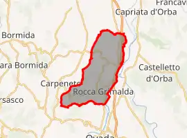 Rocca Grimalda (Ra Roca in dialect) is a village and comune in the province of Alessandria, Piedmont, Northern Italy. It lies in Upper Montferrat, a historical region of Piedmont, and it was built upon a rocky hill on the Orba's left bank, very close to Ovada. The nearest airport is the Cristoforo Colombo Airport in Genoa.