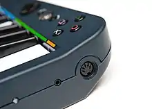 Players need to strike notes and chords, marked to specific keys on the display, to score points. In Basic mode, five white keys, from the middle C to G, each correspond to colored notes on screen, and are played in a similar manner to existing guitar and bass parts; these keys can also be used to play guitar and bass parts on the keyboard.[6][7][14][44] Overdrive is activated by pressing a special button on the controller.[11] A touch-pad in the handle of the unit functions as a pitch wheel, providing for a whammy bar-type effect on sustained notes.[11]
