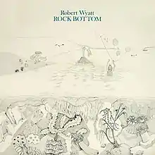 Rock Bottom has been released with two different covers, both featuring artworks by Benge. The cover found on the original LP and several reissues is a pencil drawing of a scene at an ocean shore. The upper area of the cover, inspired by a Victorian-era book cover, depicts activity along the beach and off to the horizon, while the bottom third gives an underwater view of strange animal and plant life in the sea.[4] Details include three teenage girls playing at the beach,[5] a faraway steamer, seagulls and sandcastles.[4] Benge intended the cover's subdued style to strike a contrast with the dominant trend of fantastical progressive rock album art, best typified by Roger Dean's science fiction-inspired artwork for Yes.[4] At a time when "all the covers were getting more and more complicated, competing with each other for pizzazz", Benge said, "the only way to counter that ... was to be absolutely minimal and quiet."[4]