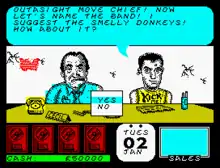 At the outset, the player can choose to hire up to four musicians to make up the band. The musicians are parodies of contemporary pop music stars. Their weekly wage depends on their abilities and their fame, ranging from £30,000 for "Bill Collins" down to just £50 for "Sidney Sparkle".