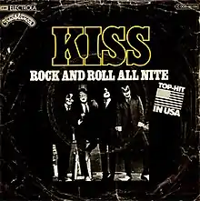 "Rock and Roll All Nite" is a song by American rock band Kiss, originally released on their 1975 album Dressed to Kill. It was released as the A-side of their fifth single, with the album track "Getaway". The studio version of the song peaked at No. 69 on the Billboard singles chart, besting the band's previous charting single, "Kissin' Time" (#89). A subsequent live version, released as a single in October 1975, eventually reached No. 12 in early 1976, the first of six Top 20 songs for Kiss in the 1970s.[2] "Rock and Roll All Nite" became Kiss's signature song and has served as the group's closing concert number in almost every concert since 1976.[3][4] In 2008, it was named the 16th greatest hard rock song of all time by VH1.[5]