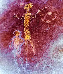 Chumash rock art is a genre of paintings on caves, mountains, cliffs, or other living rock surfaces, created by the Chumash people of Southern California. Pictographs and petroglyphs are common through interior California, the rock painting tradition thrived until the 19th century. Chumash rock art is considered to be some of the most elaborate rock art tradition in the region.[1]