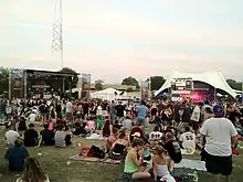 A rock festival is an open-air rock concert featuring many different performers, typically spread over two or three days and having a campsite and other amenities and forms of entertainment provided at the venue.[1] Some festivals are singular events, while others recur annually in the same location. Occasionally, a festival will focus on a particular genre (e.g., folk, heavy metal, world music), but many attempt to bring together a diverse lineup to showcase a broad array of popular music trends.[2]