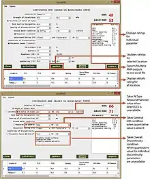 The details for calculating RMR are given by Edumine[4] and provide a series of tables for RMR determination while the latest charts for the same purpose are given in the references and further reading. In particular, the charts enclosed here for the RMR parameters intact rock strength and the combined parameters RQD and discontinuity spacing (represented by the number of discontinuities per meter), show the advantage of using the charts for better accuracy, rather than relying on the tables which show the average ratings for the ranges of each RMR parameter. The lump ratings for each parameter makes it difficult for less experienced personnel to determine the RMR accurately. There are also subjective parameters like roughness and weathering which may pose difficulty in rating assignment. Kundu et al. have proposed continuous functions for each parameter of RMR89 and RMR14 including roughness and weathering.[3] They have also developed a software "QuickRMR" based on the continuous functions to calculate RMR with quantitative inputs.
