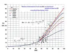 In the second chart, an improved relationship for the range of RMR greater than 56 is given. This reflects the idea that, at high RMR, deformations will be dominated by intact modulus, whereas at lower RMR weathering and joint infilling will largely control deformation. This approach has the advantage that modulus values are NOT overestimated at the higher range nor underestimated or overestimated at the lower range. This is more realistic than relying on one sigmoidal equation.