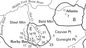 Rocky Bar is a ghost town in Elmore County, Idaho, United States. At its height in the late 19th century Rocky Bar boasted a population of over 2,500 and served as county seat of Alturas County from 1864 to 1882. It was also the original county seat of Elmore County when it was created in 1889. :)
