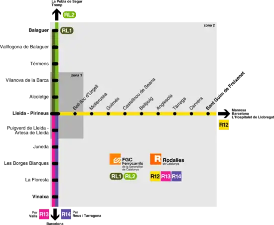 | RL1 | Lleida Pirineus – Balaguer | 6 trains per day | 6 | 26.1 km 16.3 mi |