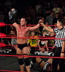 On May 22, 2010, Strong turned into a villain and debuted Truth Martini as his new manager.[14] At the following pay-per-view, Death Before Dishonor VIII, on June 19, Strong defeated Colt Cabana, Steve Corino, Shawn Daivari, Tyson Dux and Eddie Edwards in a gauntlet match, with an assist from Martini, to earn the right to challenge for the ROH World Championship.[15] On September 11, 2010, at Glory By Honor IX, Strong defeated Tyler Black in a No Disqualification match to win the ROH World Championship for the first time.[16] He then took a brief leave of absence from ROH to travel to Pro Wrestling Noah with ROH World Television Champion Eddie Edwards to participate in the Nippon Television Junior Heavyweight Tag League.[17][18] On March 2, 2011, ROH announced that Strong had signed a new contract with the promotion.[19] Just over two weeks later, on March 19, Strong lost the ROH World Championship to Eddie Edwards at Manhattan Mayhem IV.[20][21]