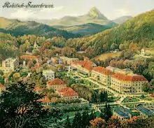 The name Rogaška Slatina literally means 'Rogatec springs', referring to a source of mineral water.[3] The springs were dubbed Roitschocrene 'Rogatec springs' (< Greek κρήνη crene 'spring') in 1687 by Johann Benedikt Gründel. The settlement was known as Rohitsch-Sauerbrunn or Sauerbrunn Curort in German[2] (and in older sources also Roitscher Sauerbrunn).[4][5] Older sources also contain the Slovene names Slatina Zdravišče and Slatina Rogačka.[2]