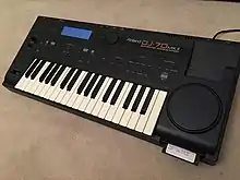 The Roland DJ-70MKII was released in 1996 by Roland Italy. It had 37 keys,[3] 8 Play Pads (Pitchbender Joystick and featured the first ever for DJ's a Special Scratch Dial/Scratch Pad), 24 Voice Note Polyphony,[4] 8 Track music sequencer, with RPS/BPM Function and featured a 3.5"in. floppy disk drive (2DD/2HD),[5] "Load-While-Play" feature, SCSI port only on Roland DJ-70MKII. It also had a large backlit LCD screen. The Roland DJ-70MKII with its more powerful features then the Roland DJ-70, was essentially a Roland S-760 rack mount sampler with a keyboard.