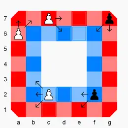 - A pawn moves and captures one step orthogonally forward on the ring on which it currently stands, or one step diagonally forward to either ring. A pawn does not move backward or sideways, and there is no initial two-step option. A pawn promotes to rook or bishop when reaching either of the two starting squares of the opponent's pawns.