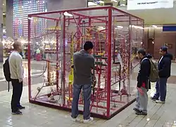 A rolling ball sculpture (sometimes referred to as a marble run, ball run, gravitram, kugelbahn (German: 'ball track'), or rolling ball machine) is a form of kinetic art – an art form that contains moving pieces – that specifically involves one or more rolling balls.