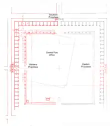 The forum has rectangular shape, close to the shape of a square, with dimensions: 143 m in north-southern direction and 136 m in east-western direction. A complex of public buildings was built to the North, dominating over the rest of the buildings at the square. Three entrances, situated along the axes of the eastern, southern and western edge, provide access to the streets, located at the sides of the Forum. The main streets cardo and decumanus maximus intersect outside the eastern entrance of the complex.