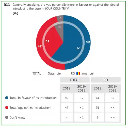 The latest Flash Eurobarometer[49] shows that a majority of Romanian respondents supports introducing the euro on the national market. With a decrease of 8 percentage points, 61% of Romanians are in favor of euro adoption.