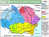 Romanians speak a language originating from the dialects of the Roman provinces north of the "Jireček Line".[25] This line divided, in Roman times, the predominantly Greek-speaking southern provinces from those where Latin was the principal language of communication.[26] The emergence of Proto-Romanian from Vulgar Latin is first demonstrated by the words "torna, torna, frater" ("turn around, turn around, brother") recorded in connection with an Eastern Roman military action in 587 or 588.[27][28] The soldier shouting them "in his native tongue"[29] spoke an Eastern Romance dialect of the Balkan Mountains.[30]