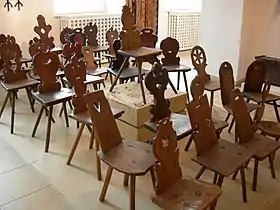 One of the museum's most famous exhibits—originally the work of Tzigara-Samurcaș—is "the house in the house". The house, which originally belonged to peasant Antonie Mogos of Ceauru village in Gorj County. From the first, the house was displayed in a non-naturalistic way: objects that would normally be in the interior were displayed in various manners outside; outbuildings were suggested by fragments. The Communist regime displayed the house much more conventionally, outdoors at the Village Museum; it returned to the Peasant Museum in 2002. The current display at the Peasant Museum revives the original non-naturalistic approach. For example, from a platform, museum visitors may peer into the attic, part of whose wall is stripped away; various objects are arranged inside.[6]