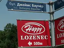 The new system is not always used properly. One of these signposts in Sofia shows the name of the district of Lozenets written according to the international scientific system of transliteration (c = ts), but in the other the name of the Irish journalist James Bourchier has been "relatinised" according to the official Bulgarian system (Dzheyms Baucher), even though the system obviously does not apply to names that have authentic Roman spellings.