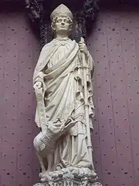 Saint Romanus of Rouen (French: Romain; reconstructed Frankish: *Hruomann; died c. 640 AD) was a scribe, clerical sage, and bishop of Rouen. He would have lived under Dagobert I (629–39), though his date of birth is unknown. His life is known in legend and tradition[1] and is shown in the stained glass windows (c. 1521) and south gate of Rouen Cathedral and the stained glass windows of the église Saint-Godard (1555). The Catholic Encyclopedia claims that his legend has little historical value[2] with little authentic information.[3] He was both Lord Chancellor of France and Référendaire of France. (For Saint Romanus, Martyr, please see Romanus of Caesarea).