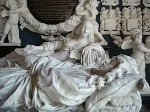 Verhulst is mainly remembered for this many tomb monuments for private and public patrons. His funeral monument for Maria van Reygersbergh of 1663 established his reputation in this area with its new and imposing style. He made many church monuments erected to commemorate Dutch naval heroes.[9] His chief work in this area (though possibly not his most successful creation) is the decorated tomb of the Dutch naval hero Michiel de Ruyter in the Nieuwe Kerk in Amsterdam. Another important tomb monument was that of Carl Hieronymus Baron van In- en Kniphuizen and Anna van Ewsum made for the Dutch Reformed church in Midwolde (Westerkwartier). It was made at the request of the widow of the Baron and was one of the few private commissions for tomb monuments in the Dutch Republic. It is a variation on the traditional double tomb, which combines two figures, the recumbent dead person, and the other living one raised on an elbow. The widow Anna van Ewsum takes centre stage by gazing straight at the viewer. A statue of the second husband of the widow made by Bartholomeus Eggers was later added to the tomb replacing two putti holding memento mori symbols.[12]