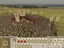 In addition to the turn-based campaign, Rome: Total War also features 3D, real-time battles. Battles can be played as a part of the larger campaign, as a custom battle against the AI, as a preset "historical battle" based on a real-life military engagement, or as a multiplayer battle against other players. As opposed to the campaign, which features an overhead map of the world, battles take place on individual battlefields. The terrain of the battlefield can play a key role in how the battle plays out. In most cases, the ultimate goal of the battle is to defeat the enemy forces by either killing or routing all of their troops; in a siege, the attacker can also achieve victory by capturing and holding the town center for a period of time. In battles, the player commands a variety of soldiers that are arranged into units. The game features a variety of units for battle, which may be broadly categorised into infantry, cavalry, archers, and siege weapons. Different units have different morale, hit points, and general combat skills. If a unit's morale drops too low, its soldiers try to flee the field.[15] Units can create different formations that alter how they perform in combat; for example, many types of spearmen can form the phalanx formation, while many Roman soldiers can form the testudo. Both of these formations sacrifice mobility in favour of defensiveness. The player can also employ complex tactics to help them achieve victory; for example, soldiers can ambush enemies from a nearby forest or flank them to avoid a frontal engagement.[16]