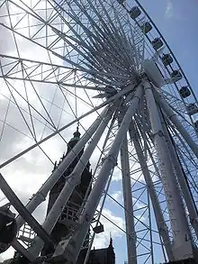 - One of the most famous and well-travelled Bussink R60 wheels is the 60-metre (197 ft)[9][10] tall Roue de Paris, originally installed on the Place de la Concorde in Paris for the 2000 millennium celebrations. Roue de Paris left France in 2002 and in 2003-2004 operated in Birmingham and Manchester, England. In 2005 it visited first Geleen then Amsterdam, Netherlands, before returning to England to operate at Gateshead. In 2006 it was erected at the Suan Lum Night Bazaar in Bangkok, Thailand, and by 2008 had made its way to Antwerp, Belgium.[11] Roue de Paris uses 40,000 litres (8,800 imperial gallons) of water ballast to provide a stable base. It weighs 365 tonnes (402 short tons), and can be erected in 72 hours and dismantled in 60 hours by a specialist team. Transport requires seven 20-foot container lorries, ten open trailer lorries, and one closed trailer lorry. Its 42 passenger cars be loaded either 3 or 6 at a time, and each car can carry 8 people.[9]