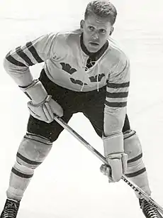 During the 1952–53 season Pettersson debuted at age 17 for his hometown team Surahammars IF in Division 1, the highest level of ice hockey in Sweden at the time. He played five games, scoring no goals. The following season Pettersson played ten games, scoring nine goals, only one goal shy of the team's scoring leader Arne Holmgren. Surahammar were relegated to Division 2 for the 1954–55 season, where Pettersson set a new club record as he scored 23 goals in seven games.[5] In 1955 Pettersson left Surahammar as he was enlisted to do conscript service in the Swedish Navy, stationed in Stockholm's archipelago.[4] In Stockholm he was supposed to sign a contract with Djurgårdens IF, but rival club Södertälje SK were faster with the transfer papers and Pettersson signed with them instead.[4] In 1956 he won the Swedish Championship with Södertälje, scoring one goal in the decisive game against Djurgården which Södertälje won 3–1.[6]