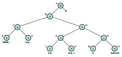 For example, to find the character at i=10 in Figure 2.1 shown on the right, start at the root node (A), find that 22 is greater than 10 and there is a left child, so go to the left child (B). 9 is less than 10, so subtract 9 from 10 (leaving i=1) and go to the right child (D). Then because 6 is greater than 1 and there's a left child, go to the left child (G). 2 is greater than 1 and there's a left child, so go to the left child again (J). Finally 2 is greater than 1 but there is no left child, so the character at index 1 of the short string "na" (ie "a") is the answer.