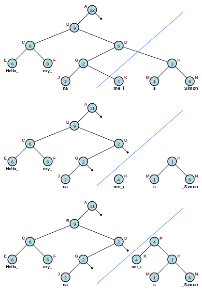 For example, to split the 22-character rope pictured in Figure 2.3 into two equal component ropes of length 11, query the 12th character to locate the node K at the bottom level. Remove the link between K and G. Go to the parent of G and subtract the weight of K from the weight of D. Travel up the tree and remove any right links to subtrees covering characters past position 11, subtracting the weight of K from their parent nodes (only node D and A, in this case). Finally, build up the newly orphaned nodes K and H by concatenating them together and creating a new parent P with weight equal to the length of the left node K.
