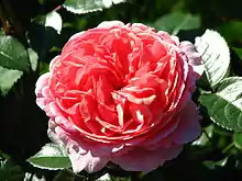 The rose is described as a very double apricot flower. It has an old fashioned, quartered bloom form with up to 100 petals, and a light, spicy fragrance.[1][4] The colour is weather dependent, reaching from deep orange to soft pink. The buds open slowly to medium-sized flowers with a diameter of 8 to 10 centimetres (3.1 to 3.9 in), are well suited as cut flowers and appear abundantly in flushes throughout the season.[5]