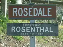 Rosedale is a small town in the south western Barossa Valley in South Australia. Prior to renaming placenames of enemy origin in 1918, Rosedale was named Rosenthal.