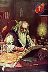 Some modern scholars, for example Adam McLean and Giordano Berti, assume that among the first followers of the Rose Cross there was also the German theologian Daniel Cramer, who in 1617 published a bizarre treatise entitled "Societas Jesus et Rosae Crucis Vera" (The True Society of Jesus and the Rosy Cross), containing 40 emblematic figures accompanied by biblical quotations.[19]