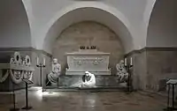 Upon the death of Christian IV in 1648 the interior had not been completed, and the king's coffin was placed in the crypt below instead. The king had commissioned his own monument, depicting him and his queen kneeling before a crucifix, but since it had been completed before his death, the monument had been temporarily placed in storage in the king's arsenal. When the arsenal burned in 1647, all that remained of the monument was the grand sandstone crucifix and a head carved from alabaster. The crucifix was subsequently placed in Holmen Church, while the head was given to the National Museum of Denmark.[31] The king's successors were each unable to provide a fitting resting place for the king, and it was not until 1840 and Christian VIII that work was finally begun. He had hoped to see the project finished by 1848, the 200th anniversary of Christian IV's death, but it was not until 1870 that the work was completed.[32]