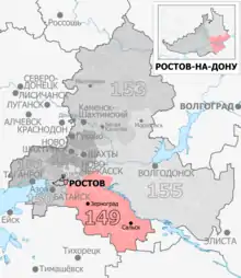 The Rostov constituency (No.149[lower-alpha 1]) is a Russian legislative constituency in Rostov Oblast. The constituency stretches from eastern Rostov-on-Don to southern Rostov Oblast. Until 2007 the constituency was more compact and was actually based in western Rostov-on-Don, however, after 2015 redistricting territory of the former Rostov constituency was placed into Nizhnedonskoy constituency, while new Rostov constituency was created from parts of Proletarsky and Belaya Kalitva constituencies.