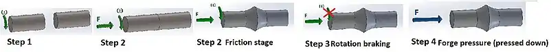 - Step 1 and 2, friction stage: one of the component is set in rotation, and then pressed to the other stationary one in axial of rotation,