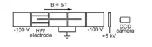 For this application, a plasma is stored in a Penning–Malmberg (PM) trap[1] in a uniform magnetic field, B. The charge cloud is typically cylindrical in shape with dimension along B large compared to the radius. This charge produces a radial electric field which would tend to push the plasma outward. To counteract this, the plasma spins about the axis of symmetry producing a Lorentz force to balance that due to the electric field, and the plasma takes the form of a spinning charged rod. Such cold, single-component plasmas in PM traps can come to thermal equilibrium and rotate as a rigid body at frequency