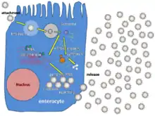 The virus is transmitted by the faecal-oral route. It infects and damages the cells that line the small intestine and causes gastroenteritis (which is often called "stomach flu" despite having no relation to influenza). Although Rotavirus was discovered in 1973 by Ruth Bishop and her colleagues by electron micrograph images[5] and accounts for approximately one third of hospitalisations for severe diarrhoea in infants and children,[6] its importance has historically been underestimated within the public health community, particularly in developing countries.[7] In addition to its impact on human health, rotavirus also infects other animals, and is a pathogen of livestock.[8]