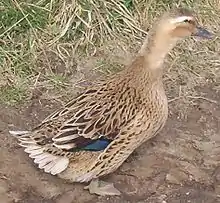 The plumage coloring of both the Rouen drake and the Rouen duck are nearly identical to that of the Mallard drake and Mallard duck. The Mallard color pattern is referred to as gray.[1] Males have green heads, white collars, black tail coverts and dark, ashy brown tail feathers,[2] a gray body, and a deep claret breast. The female Rouen hens are a consistent shade of mahogany brown, with a brown crown and tan eye-stripes extending from bill to the back of the eyes. Another feature of the female color pattern is the distinct, detailed penciling found on feathers of the head, neck, body, most of the wing and tail.[2] Rouen females can be much darker brown than Mallard females. Both sexes also have blue speculum feathers. However, Rouen speculum feathers are brighter in color and larger in size than that of the Mallard. Adult Rouen ducks are typically significantly larger than Mallard ducks. The Rouen duckling is identical to the Mallard duckling in terms of plumage coloring. In North America, two distinct types are bred: the common, or production-bred, variety that is larger than a Mallard but has a typical duck conformation, and the much larger and squarer standard-bred variety. The production variety normally weighs 6–8 lbs (2.7–3.6 kg) while the standard-bred weighs 9–12 lb (4.1–5.4 kg).