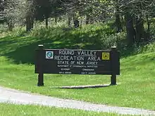 The Round Valley Reservoir in Clinton Township in Hunterdon County, New Jersey, United States, was formed in 1960 when the New Jersey Water Authority constructed two large dams and flooded a large valley. The reservoir is named after the naturally formed circular valley surrounded by Cushetunk Mountain. The deep valley was caused by erosion of the soft sedimentary rock. The surrounding ridges of Cushetunk Mountain endure because they were underlaid with dense and durable volcanic rock diabase that cooled slowly under the surface of the earth. The reservoir covers what used to be a farming community, with remains of a school and a church on the lake floor among other buildings.[1][2]