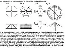 A playground roundabout (or merry-go-round) is a flat disk, frequently about 2 to 3 metres (6 ft 7 in to 9 ft 10 in) in diameter, with bars on it that act as both hand-holds and something to lean against while riding. The disk can be made to spin by pushing or pulling on its handles, either by running around the outside, or by pulling and re-grabbing as it spins, from a stationary stance. If the disk is mounted at a tilt to the ground, after an initial push, the disk can be speeded up without further pushing or touching the ground. The trick is to have the rider(s) lean into the center of the disk while ascending and leaning out from the center when descending. It is the physics of Angular Momentum and also works for swings. Often found in school playgrounds and public parks, they offer riders (typically children) a dizzying ride when either others spin the wheel, or by spinning it themselves by running around it, and then jumping on. People may take turns between riding and spinning. One type of roundabout which differs significantly in terms of how the rotary motion is provided is a Swedish device called the HAGS Pedal Roundabout, which resembles four small exercise bikes attached to a tubular steel ring, which travel on a circular steel rail on the ground. The ring is attached to a vertical pole in the center by four spokes. There is a driving wheel hidden under the casing of each of the "exercise bikes" (the casings prevent toes being run over) and the roundabout is turned by the pedaling action of the riders.[1]