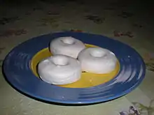 The rousquille or rosquille (rosquilla in Catalan) is a type of sweet-tasting biscuit particular to Catalonia, including the French region of Languedoc-Roussillon. It is a ring-shaped, soft and crumbly pastry often covered with a layer of sugar icing.