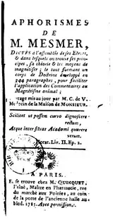 - Mesmer, F.A. (1779), Mémoire sur la découverte du magnetisme animal ('Memoir on the Discovery of Animal Magnetism'), Geneva and Paris: P. Fr. Didot: includes Mesmer's "27 Propositions", as an appendix (pp. 74-85); complete translation (including "Propositions") at Tinterow (1970), pp. 32-57, and at Bloch (1980), pp. 41-79; translation of "Propositions" (only) at Binet & Féré (1888), pp. 5-8, Anon (1911/1912), pp. 1557-1558 Goldsmith (1934), p. 117-121, Buranelli (1975), pp. 101-103, Wyckoff (1975), pp. 76-78, and Pattie (1994), pp. 87-89..