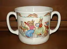 Royal Doulton Bunnykins tableware and figurines are popular ceramic designs manufactured as nursery dishes and collectible figurines. The chinaware line originated with artwork by Sister Mary Barbara Bailey (née Barbara Vernon Bailey), the daughter of Cuthbert Bailey, general manager of Doulton during the 1930s. Unbeknownst to the public, Mary Barbara Bailey was not a professional illustrator, but a nun in the Augustinian Canonesses of the Lateran.[1] Sister Mary Barbara provided illustrations to the designers of Doulton & Co. to be used on tableware. Six Bunnykins figurines were produced based on Sister Mary Barbara's illustrations in 1939 and were designed by Charles Noke. Discontinued during World War II, Bunnykins figurines were not reintroduced until 1969. Bunnykins continued to be produced in England until 2005. Bunnykins figurines and tableware are currently produced in Asia.