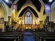 Both the main altars at the east end of the church are of wood and were originally without any form of hangings. The carving on the front of the main altar is very fine; it was presented to the Church by the All Saints Branch of the Guild of St Helene. The various frontals and hangings used on the altar throughout the Church Year have been received from various donors.[13]