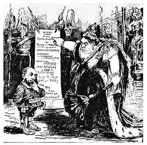 In April 1869 Sir Charles Mordaunt (1836–1897) learnt that his wife Harriet had had three separate affairs, and that her lovers included the heir to the throne. Although Mordaunt did not carry out his threat of citing the prince as co-respondent in the subsequent divorce case, Edward was subpoenaed to appear in court as a witness.[13] Although Edward did not want to appear—and the queen wrote to the Lord Chancellor to see if this could be avoided—the law was such that the prince could be forced to appear if necessary.[14] He appeared voluntarily and was in the witness box for seven minutes, during which time he denied having had a sexual relationship with Mordaunt's wife; he was not cross-examined. Edward's biographer, Colin Matthew, wrote that "the hearing coincided with general criticism of the very different deportments of both the queen and the prince. The latter was several times booed in public".[13] Despite the "taboo on open criticism on [Edward's] actions, an undercurrent of dissatisfaction existed" with him and his actions.[15] For Edward, although such affairs could be discussed between friends, scandal was to be avoided wherever possible.[16]