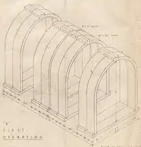 Ruck's design was based on precast half-arch concrete sections produced by Hydroprest Concrete Ltd at Scunthorpe.[3] Four 12-inch (30.5 cm) sections formed an arch with inside dimensions 5 ft (1.5 m) wide, 7 ft (2.1 m) high and 2 ft (61 cm) long. Any number of the arches could be assembled together to form a structure of a desired length, but for Ruck's design 20-inch gaps between the arches would be left to serve as embrasures, with an inside length of 12 ft (3.7 m). The arches were clad with two layers of mortar and concrete paving slabs; this filled in the gaps except where an embrasure was required and gave a wall thickness that varied between 6 and 9 inches (15 and 23 cm). The ends were walled up with hollow concrete blocks filled with bricks; the wall at one end had an embrasure, the other end had an entrance. The concrete offered only limited protection, so the structure would be partly buried and then surrounded by an outer wall of sandbags to the level of the embrasures and the gap between the wall and the concrete filled with rammed earth.[3]